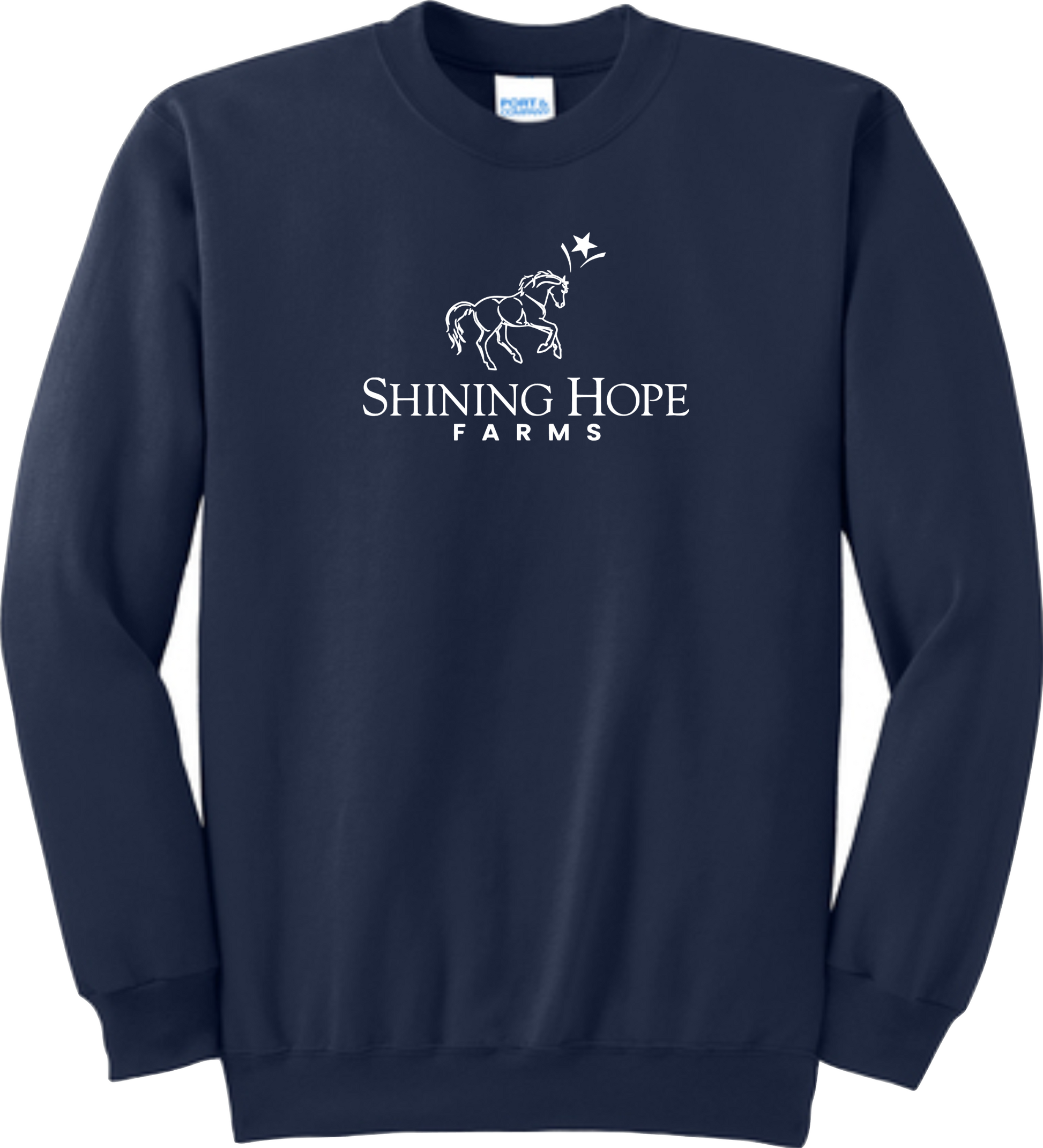 Show your support for Shining Hope Farms with this screen printed soft fleece crew neck sweatshirt. This sweatshirt is made of 50/50 ring spun cotton/poly.